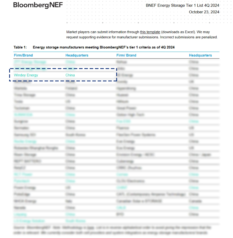 On October 23, Bloomberg New Energy Finance (BNEF) released “BNEF Energy Storage Tier 1 List 4Q 2024”. WINDEY Intelligent Energy Storage Company (the Company) was successfully ranked onto the list for its trustworthy product quality, leading technological strength, and outstanding financing capabilities.
