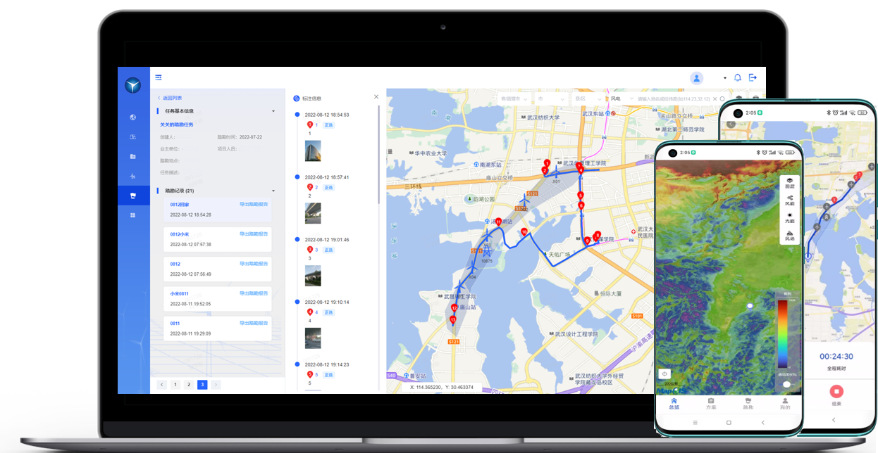 “紙上得來終覺淺,絕知此事要躬行”,對于已經(jīng)規(guī)劃好的方案,需要進(jìn)行現(xiàn)場實地踏勘,復(fù)核點位有效性,進(jìn)行更改或者微調(diào)以確保最終建設(shè)方案的可行性。馭風(fēng)移動端內(nèi)置離線天地圖(包含衛(wèi)星影像)、資源圖譜、項目方案資料,可根據(jù)初步方案逐個點位進(jìn)行考察,利用GPS定位、地理信息查詢、風(fēng)參數(shù)查詢、踏勘軌跡記錄、圖文影像標(biāo)注等功能記錄每個點位周邊的環(huán)境情況、建設(shè)條件、道路條件等情況,為后續(xù)施工建設(shè)做信息儲備。在全場踏勘結(jié)束后會自動生成踏勘報告并將踏勘任務(wù)同步至Web端,實現(xiàn)雙端聯(lián)動,用戶可以在任意設(shè)備靈活查看、分享記錄。