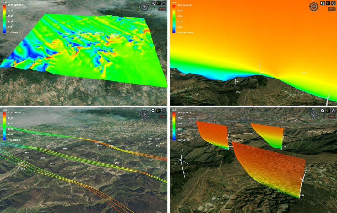 “運風”還對CFD仿真各環(huán)節(jié)的關鍵參數(shù)進行大量測試、驗證,并研發(fā)了基于仿真結果特征的收斂判據(jù),最終形成了一套自動化程度極高的CFD仿真流程。利用“運風”,無任何CFD基礎的用戶也可以發(fā)起流動仿真,并獲得可靠結果,從而專注于項目評估和結果分析。此外,“運風”還集成了基于GIS的3D可視化模塊,將流場仿真結果實景呈現(xiàn)于地形之上,方便用戶查看和分析。