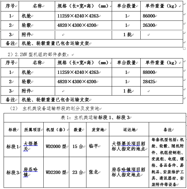 1、主機類(含機艙、輪轂及相關(guān)附件等)運輸:分為標(biāo)段1、標(biāo)段3共計二個標(biāo)段;