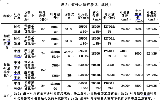 2)二個項目槳葉運輸?shù)陌l(fā)運地及技術(shù)參數(shù)見表